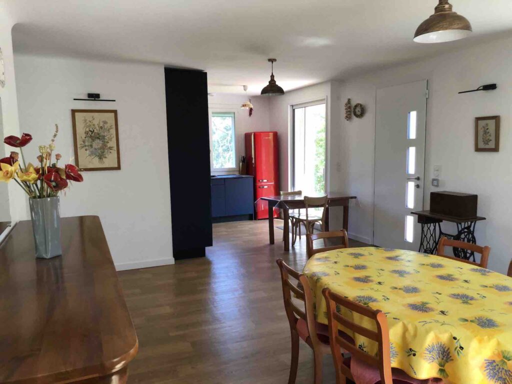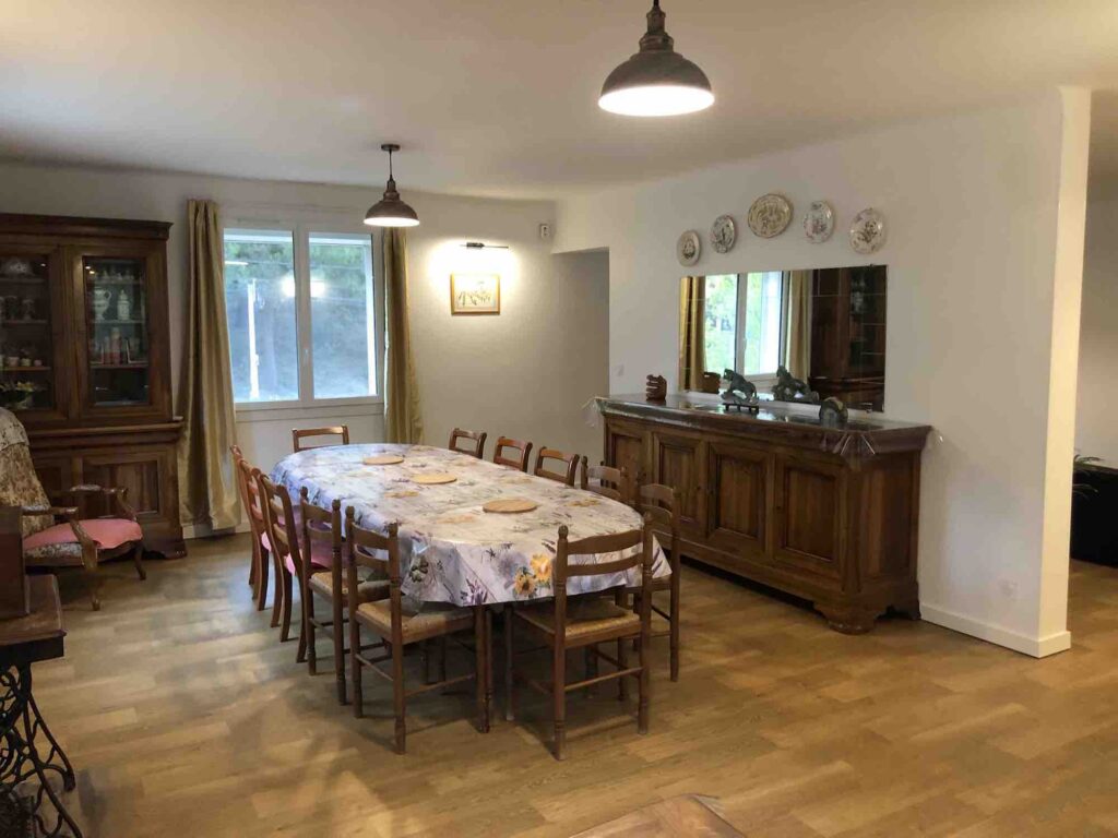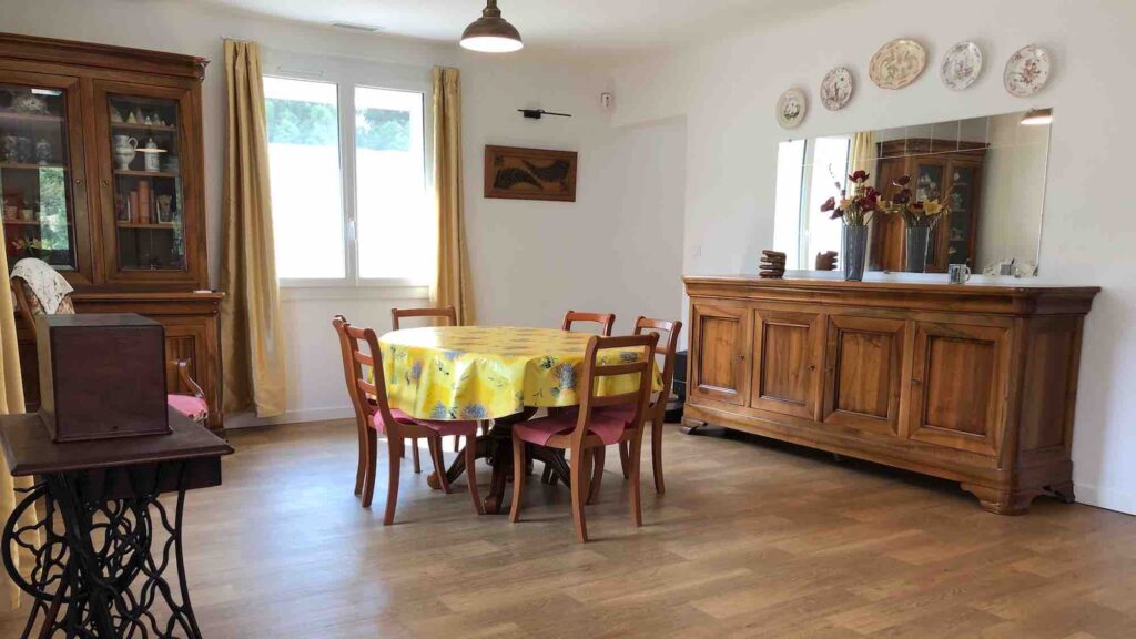 A l’étage, la spacieuse salle à manger permet de manger à douze très confortablement, ou plus en alignant la table de la cuisine. La cuisine toute équipée est un régal pour celui qui aime faire plaisir ou bien manger.